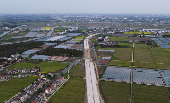 目前,長三角生態(tài)綠色一體化發(fā)展示范區(qū)已全面密集施工。 圖為連接上海市金山區(qū)與浙江省嘉善縣的葉新公路-姚楊公路項目施工現(xiàn)場。