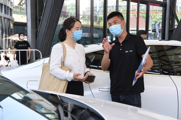 6月6日,在北京華熙LIVE·五棵松商業(yè)街區(qū)舉辦的“北京消費(fèi)季之悅動(dòng)海淀”活動(dòng)現(xiàn)場,工作人員(右)向市民介紹一款汽車的配置。當(dāng)日,北京消費(fèi)季正式開啟,進(jìn)一步推動(dòng)北京各行業(yè)復(fù)商復(fù)市,加快實(shí)現(xiàn)消費(fèi)回暖。