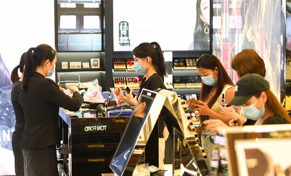 游客在海口日月廣場免稅店選購化妝品。