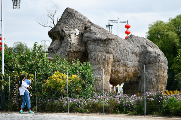 游客在天津市寶坻區(qū)黃莊鎮(zhèn)小辛碼頭村里參觀用稻草制作的動(dòng)物。新華社發(fā)(孫凡越 攝)