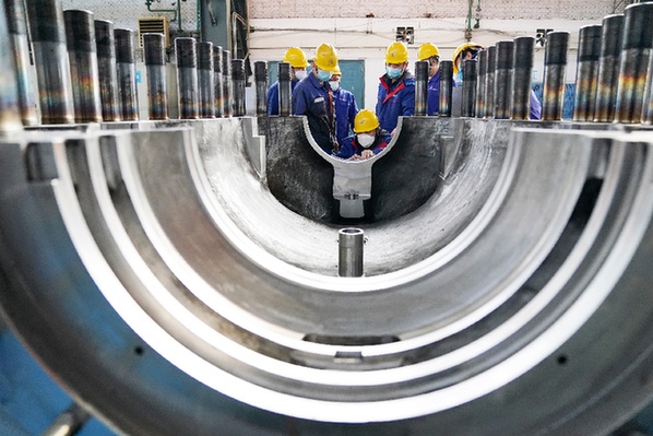 在哈電集團(tuán)哈爾濱電機(jī)廠有限責(zé)任公司的生產(chǎn)車間,工人在進(jìn)行生產(chǎn)作業(yè)。