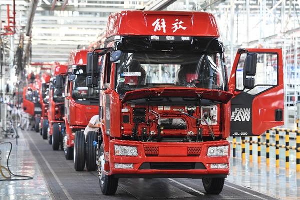 在位于長(zhǎng)春的一汽解放總裝車間,車輛在生產(chǎn)線上等待裝配。中國(guó)一汽前三季度銷售整車超265萬(wàn)輛,同比增長(zhǎng)8%。記者 張楠 攝