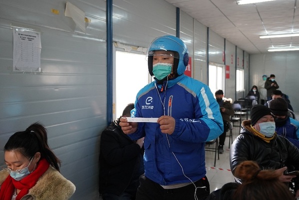 今年35歲的張衛(wèi)鵬是餓了么平臺(tái)的一名外賣騎手,和他一起接種的還有幾十位同樣留在北京過(guò)春節(jié)的騎手同事。
