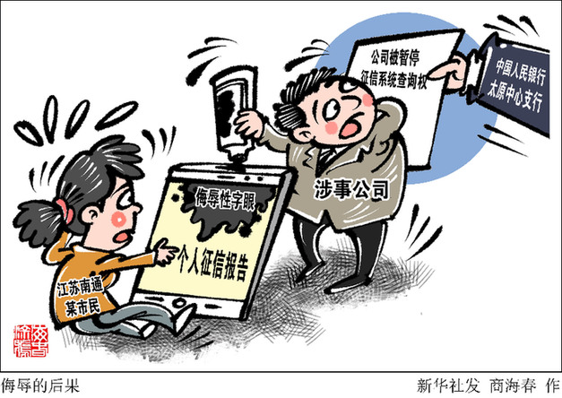 ????近日,江蘇南通市民房女士在查詢個(gè)人征信報(bào)告時(shí)發(fā)現(xiàn),職業(yè)信息“工作單位”一欄中出現(xiàn)侮辱性字眼。經(jīng)中國人民銀行南通中心支行協(xié)調(diào),目前作為信息報(bào)送方的晉商消費(fèi)金融對該信息作出刪除處理。