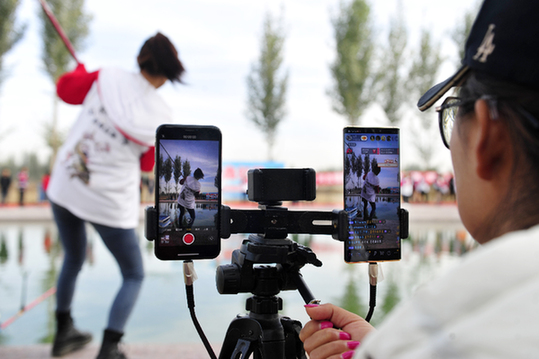 在肅寧縣舉行的一場釣魚比賽中,主播利用直播平臺現(xiàn)場直播,向網(wǎng)友推介肅寧魚竿。新華社發(fā)(苑立偉 攝)