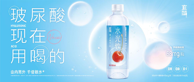 此次宜簡推出的水光飲玻尿酸飲品,每瓶含玻尿酸成分68mg。相較市面上含有玻尿酸成分的產(chǎn)品,一片玻尿酸面膜的含量約為5-15mg,一支玻尿酸針劑的含量約20mg,宜簡水光飲一瓶68mg的添加量無疑是具備市場競爭力的。據(jù)悉,該核心成分源自玻尿酸龍頭企業(yè)--華熙生物的專利原料。據(jù)華熙生物研究,玻尿酸具有良好的保濕性和增強(qiáng)皮膚組織彈性功能,1g玻尿酸可結(jié)合1kg水分,持續(xù)性的補(bǔ)充可以清除體內(nèi)自由基從而延緩組織衰老。簡而言之,就是增加皮膚水分、抗氧化和抗衰老。