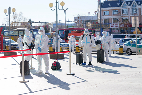 手拿轉(zhuǎn)運(yùn)者的信息表、身穿防護(hù)服、頭戴隔離面罩,黑河市愛輝區(qū)西興街道工作人員正在一邊核對轉(zhuǎn)運(yùn)者信息,一邊引導(dǎo)他們進(jìn)入客運(yùn)站。這些轉(zhuǎn)運(yùn)者將在這里乘大巴前往隔離點(diǎn)進(jìn)行集中隔離。