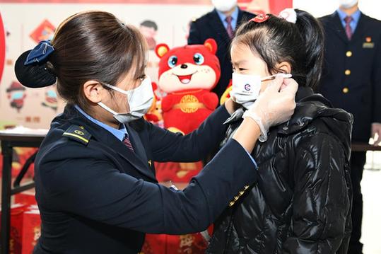 1月16日,在常州站候車室防疫宣傳活動現場,鐵路工作人員為候車小朋友戴好口罩。新華社發(fā)(史康 攝)