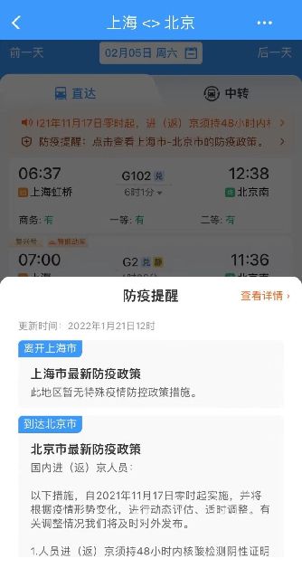 各地防疫新政可在鐵路12306APP上進(jìn)行查詢。例如,查詢上海到北京的列車,在購票頁面的最上端點(diǎn)開兩地的“防疫提醒”。