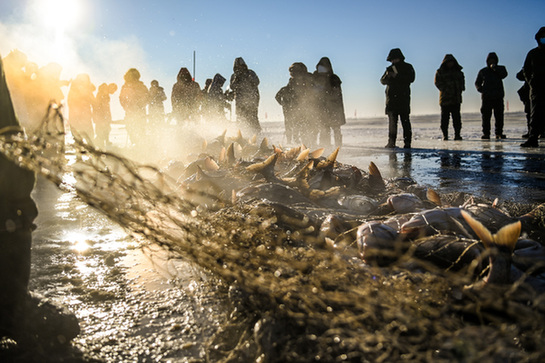 晨曦微露,白茫茫的查干湖面鋪上一層暖色,漁民們齊聲喊著號子,用“冰镩子”打出冰窟,將長桿沿著冰窟把漁網(wǎng)送進水里。七八個小時后,清脆的揚鞭聲中,八匹馬喘著粗氣拉動絞盤,漁網(wǎng)一寸寸從冰窟里浮出水面,數(shù)萬斤魚在氤氳的水氣中連蹦帶跳地被拉上冰面。游客沸騰了,拍照、選魚、直播……兩個小朋友抬起一條30斤的胖頭魚,快樂歡呼。