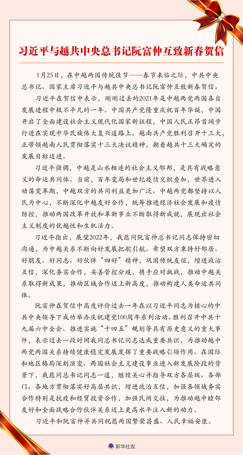 習(xí)近平指出,展望2022年,我愿同阮富仲總書記同志保持密切溝通,為中越關(guān)系不斷向好發(fā)展把舵引航。希望雙方秉持好鄰居、好朋友、好同志、好伙伴“四好”精神,鞏固傳統(tǒng)友誼,增進(jìn)政治互信,深化務(wù)實(shí)合作,妥善管控分歧,攜手應(yīng)對(duì)挑戰(zhàn),推動(dòng)中越關(guān)系取得新成果,推動(dòng)區(qū)域合作邁上新高度,推動(dòng)構(gòu)建人類命運(yùn)共同體。
