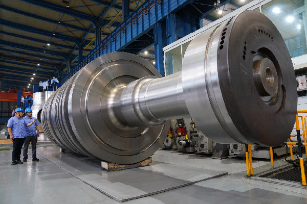 2021年7月1日,中國(guó)一重集團(tuán)有限公司軋電制造廠生產(chǎn)車(chē)間,工人在對(duì)企業(yè)自主制造的百萬(wàn)千瓦整鍛低壓轉(zhuǎn)子進(jìn)行檢測(cè)作業(yè)。新華社記者 王建威 攝