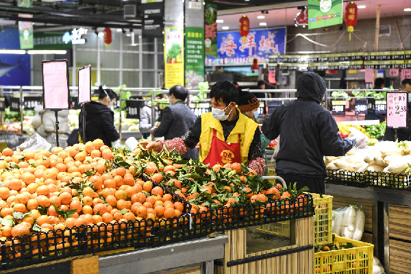 2月9日,工作人員在廣西德保縣一家超市內(nèi)補充投放新鮮水果。