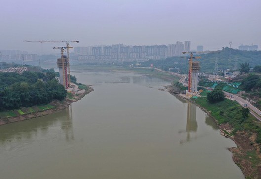 圖為2021年10月27日拍攝的四川瀘州沱江特大橋施工現(xiàn)場(chǎng),瀘州沱江特大橋是渝昆高鐵重點(diǎn)控制性工程。新華社記者 劉坤 攝