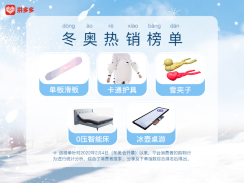 近日,冬奧盛會引發(fā)全民關(guān)注,滑雪等運動的關(guān)注度顯著增加,激發(fā)了人們對于冰雪運動的參與熱情。健兒們在賽場上拼搏,網(wǎng)友則在網(wǎng)上拼購起了滑雪裝備。2月16日,新電商平臺拼多多發(fā)布冬奧熱銷榜單,自北京冬奧會開幕以來,單板滑雪板、滑雪護具、0壓智能床、冰壺桌游等商品銷量漲幅明顯。同時冬奧“頂流”IP效應(yīng)明顯,谷愛凌同款、冰墩墩成為熱門搜索詞。
