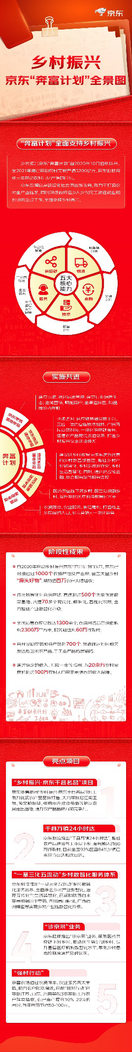 2月22日,21世紀(jì)以來(lái)第19個(gè)指導(dǎo)“三農(nóng)”工作的中央一號(hào)文件公布。文件指出,要聚焦產(chǎn)業(yè)促進(jìn)鄉(xiāng)村發(fā)展,強(qiáng)化產(chǎn)業(yè)鏈與創(chuàng)新鏈融合發(fā)展,推動(dòng)下沉供應(yīng)鏈建設(shè)。23日,京東發(fā)布鄉(xiāng)村振興“奔富計(jì)劃”全景圖,全面展示了京東服務(wù)國(guó)家鄉(xiāng)村振興戰(zhàn)略的供應(yīng)鏈、物流、技術(shù)、金融、服務(wù)五大核心能力,并公布了“鄉(xiāng)村振興·京東千縣名品”項(xiàng)目、“千縣萬(wàn)鎮(zhèn)24小時(shí)達(dá)”、“一基三化五流動(dòng)”鄉(xiāng)村數(shù)智化服務(wù)體系、“診京采”業(yè)務(wù)、“強(qiáng)村行動(dòng)”五大重點(diǎn)項(xiàng)目的最新進(jìn)展。