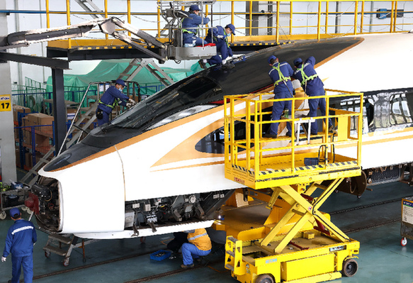 2月28日,技術(shù)人員對(duì)高鐵列車(chē)的車(chē)頭單元進(jìn)行檢修。