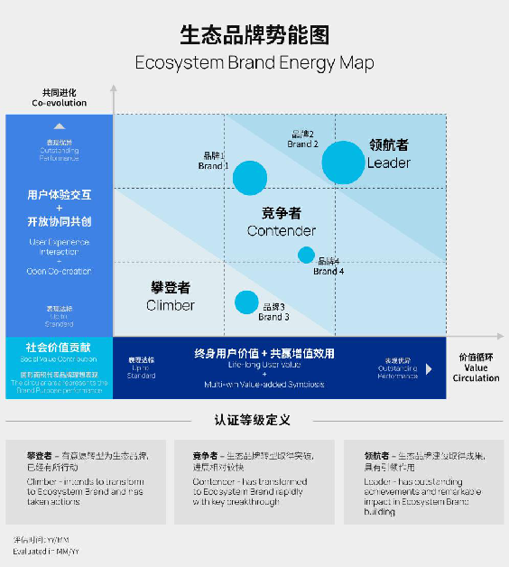 2021年,凱度、牛津大學(xué)賽德商學(xué)院、《哈佛商業(yè)評論》中文版一起合作,共同制定并全球首發(fā)「生態(tài)品牌認(rèn)證體系」,從「共同進(jìn)化」、「價值循環(huán)」和「品牌理想」三大視角及其下屬的五個核心維度(用戶體驗(yàn)交互、開放協(xié)同共創(chuàng)、終身用戶價值、共贏增值效用、社會價值貢獻(xiàn))和16項(xiàng)評估細(xì)則出發(fā),評估品牌在生態(tài)品牌轉(zhuǎn)型與打造過程中的成效和進(jìn)化階段。
