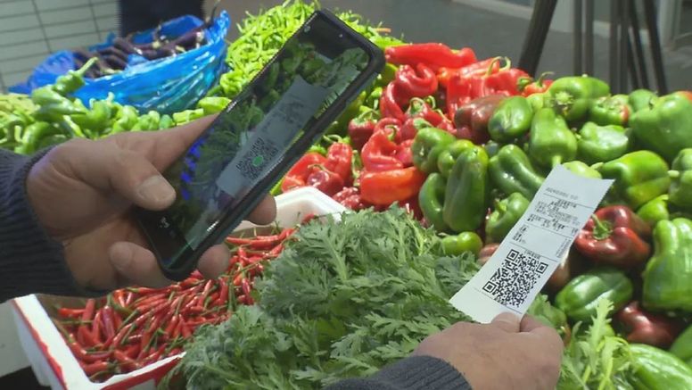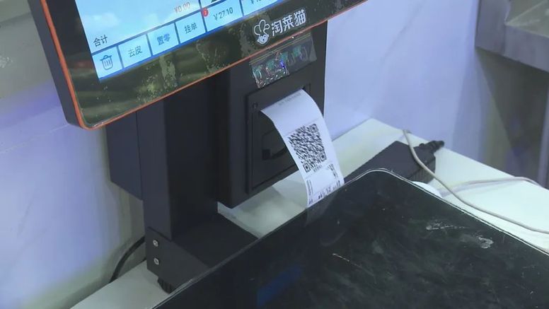 值得關(guān)注的是,在完成每次交易后,每個攤位的智能秤都會吐出一張收銀條,上面不僅有交易明細(xì),還有一個二維碼,掃一掃即可完成每件商品的溯源,而墻上這臺實時滾動的電子屏也能讓菜場、攤販和顧客對于各類購物信息和數(shù)據(jù)一目了然。