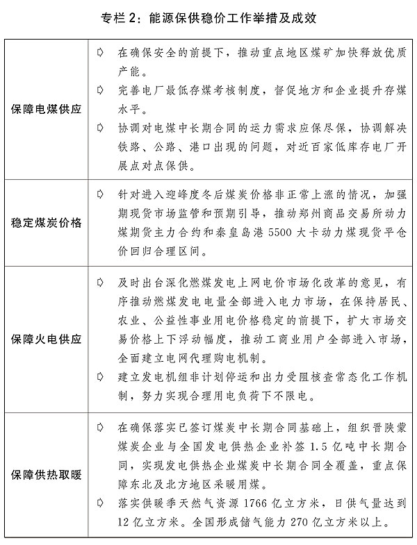 同時,統(tǒng)籌高效做好煤電油氣運調節(jié)。充分發(fā)揮煤電油氣運保障工作部際協(xié)調機制作用,壓實地方政府、部門、企業(yè)責任,堅持先立后破、民生優(yōu)先,確保能源安全供應。增強國內資源生產保障能力,加快油氣、礦產等資源勘探開發(fā),鞏固發(fā)展增儲上產良好勢頭。保障電煤供應,加大重點產煤地區(qū)和運力緊張地區(qū)的電煤運輸保障,完善煤炭市場價格形成機制,提升電力保障能力,確保穩(wěn)定可靠充足供應,完善新能源上網(wǎng)電價機制,提高天然氣氣源保障水平。有序推進能源結構調整優(yōu)化。實施全面節(jié)約戰(zhàn)略,加強精細化用能管理,確保民生和公共用能需求,推動能效低于基準水平的重點行業(yè)企業(yè)有序實施改造升級,推動全社會加強節(jié)約用電用能。完善國家戰(zhàn)略物資儲備制度。