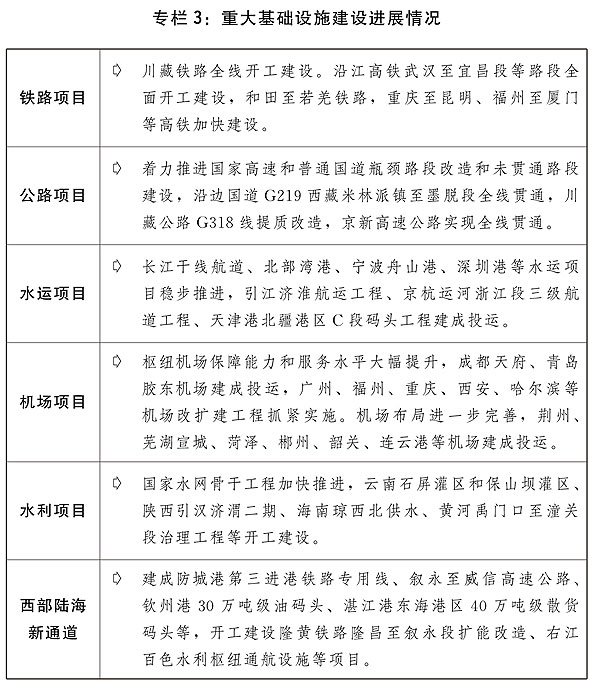 四是適度超前開展重大基礎設施建設。精準有效推進交通、水利、物流、能源、新型基礎設施、民生等領域重大基礎設施項目建設。推進川藏鐵路、西部陸海新通道、沿江高鐵、一批鐵路專用線重點項目和川藏公路G318線提質改造等加快建設。整體推進京津冀、長三角、粵港澳大灣區(qū)城市群城際鐵路、市域(郊)鐵路建設。鼓勵推廣軌道交通+土地綜合開發(fā)模式經(jīng)驗。做好中長期鐵路網(wǎng)、國家公路網(wǎng)和全國港口與航道布局規(guī)劃修編,強化國家公路、港口和高等級航道網(wǎng)絡功能。推動三峽水運新通道研究論證。實施國家水網(wǎng)重大工程。加快發(fā)展公鐵水多式聯(lián)運。提升樞紐機場綜合保障能力和服務水平,加快培育支線航空市場,提高國際航空貨運能力。加快“支點城市+骨干走廊”現(xiàn)代流通網(wǎng)絡建設。穩(wěn)步推進國家物流樞紐、國家骨干冷鏈物流基地建設,強化冷鏈運輸環(huán)節(jié)疫情防控措施,完善“321”冷鏈物流運行體系。加快物流業(yè)制造業(yè)融合創(chuàng)新發(fā)展,積極推動多式聯(lián)運、智慧物流等新業(yè)態(tài)新模式發(fā)展。布局一批新型基礎設施項目,加快推進5G、千兆光網(wǎng)、一體化大數(shù)據(jù)中心、北斗產業(yè)化重大工程、民用空間基礎設施等建設,推動傳統(tǒng)基礎設施智能化改造。