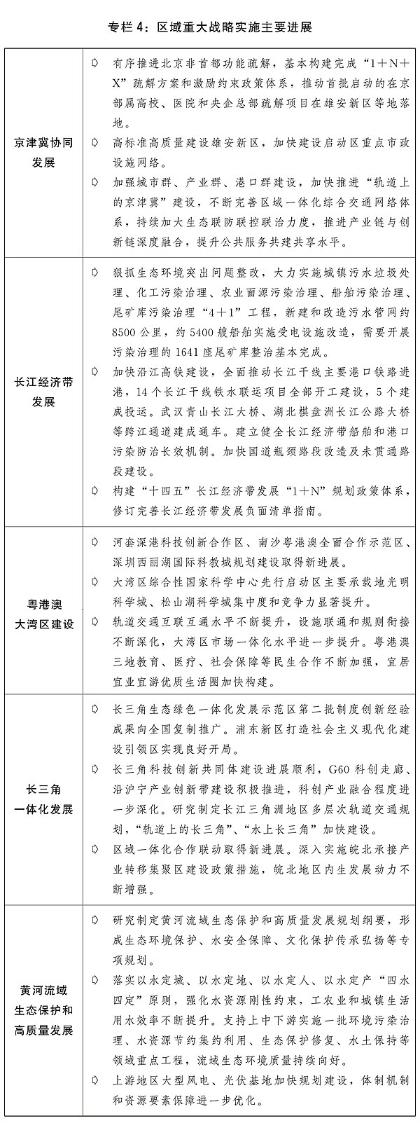 一是深入實施區(qū)域重大戰(zhàn)略。有力推動京津冀協(xié)同發(fā)展,高標準高質量建設雄安新區(qū),穩(wěn)妥有序推進率先啟動的疏解項目在雄安新區(qū)落地,落實支持北京城市副中心高質量發(fā)展的意見,加快天津港北方國際航運樞紐建設。扎實推動長江經(jīng)濟帶高質量發(fā)展,深入推進污染治理“4+1”工程,持續(xù)鞏固長江禁捕和退捕漁民安置保障工作成果,積極構建生態(tài)產品價值實現(xiàn)機制政策制度體系,建立長江流域協(xié)調機制和水生態(tài)考核機制,完善綜合交通運輸體系,力爭全線開工建設沿江高鐵,大力發(fā)展多式聯(lián)運。積極穩(wěn)妥推進粵港澳大灣區(qū)建設,堅持基礎設施“硬聯(lián)通”和規(guī)則機制“軟聯(lián)通”并舉,加快推進大灣區(qū)市場一體化進程。加快推進橫琴粵澳深度合作區(qū)高質量發(fā)展,支持前海深港現(xiàn)代服務業(yè)合作區(qū)改革開放。深化通關模式改革,落實落細教育、醫(yī)療、養(yǎng)老、交通等領域政策,進一步便利港澳居民在大灣區(qū)內地學習工作生活。提升長三角一體化發(fā)展水平,深入推進基礎設施公共服務等重點領域一體化發(fā)展,穩(wěn)步推進長三角生態(tài)綠色一體化發(fā)展示范區(qū)、皖北承接產業(yè)轉移集聚區(qū)等重點區(qū)域建設,推動科創(chuàng)產業(yè)深度融合,積極穩(wěn)妥推動港航資源整合。扎實推進黃河流域生態(tài)保護和高質量發(fā)展,嚴控高耗水作物種植面積,大力推進沿黃河大中型灌區(qū)現(xiàn)代化改造,緊抓環(huán)境污染“3+1”綜合治理,加快中游地區(qū)水土流失綜合治理,加快補齊城鎮(zhèn)污水收集管網(wǎng)和處理設施短板,推進尾礦庫環(huán)境風險隱患排查整治,加強沿黃通道建設,推動建設寧夏黃河流域生態(tài)保護和高質量發(fā)展先行區(qū)。