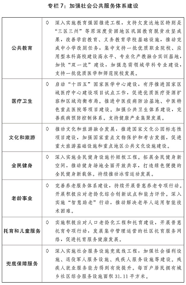 四是完善公共服務政策制度體系。分類推進基本公共服務均等化發(fā)展,推動服務重心向基層下沉,增加普惠性非基本公共服務供給。支持社會力量增加普惠性托育服務供給,進一步完善學前教育收費政策,推進普惠性學前教育資源擴容增效,推進兒童友好城市建設。推動義務教育優(yōu)質均衡發(fā)展和城鄉(xiāng)一體化,提升農村學校辦學能力,依據(jù)常住人口規(guī)模增加城鎮(zhèn)教育資源。繼續(xù)做好義務教育階段減負工作。加強縣域普通高中建設。改善職業(yè)教育辦學條件。推進高校“雙一流”建設,加快經(jīng)濟社會發(fā)展重點領域急需學科專業(yè)建設、人才培養(yǎng)和科技攻關,完善產教融合政策措施。支持中西部高等教育發(fā)展,高校招生繼續(xù)加大對中西部和農村地區(qū)傾斜力度。加強教師隊伍建設,加大中西部地區(qū)教師培訓力度。辦好特殊教育、繼續(xù)教育,規(guī)范民辦教育發(fā)展。完善三孩生育政策配套措施,將3歲以下嬰幼兒照護費用納入個人所得稅專項附加扣除,推動生育支持政策落地見效。貫徹落實積極應對人口老齡化國家戰(zhàn)略,加強養(yǎng)老托育服務體系和健康支撐體系建設,維護好老年人合法權益。推動公立醫(yī)院高質量發(fā)展,加快健全現(xiàn)代醫(yī)院管理制度,深入推進國家醫(yī)學中心、國家區(qū)域醫(yī)療中心建設項目和縣級醫(yī)院建設,加快完善分級診療體系,深化醫(yī)療服務價格、醫(yī)保支付管理和公立醫(yī)院薪酬制度改革。補齊婦幼兒科、精神衛(wèi)生、老年醫(yī)學等服務短板。持續(xù)深入開展愛國衛(wèi)生運動、推進實施健康中國行動,倡導文明健康綠色環(huán)保生活方式。實施現(xiàn)代化疾控體系建設、國家重大傳染病防治基地建設等工程,提升公共衛(wèi)生防控救治能力。加快中醫(yī)藥特色發(fā)展。推動中華優(yōu)秀傳統(tǒng)文化創(chuàng)造性轉化和創(chuàng)新性發(fā)展,促進出版、電影、廣播電視、文物等事業(yè)高質量發(fā)展,推進公共文化數(shù)字化建設,提供更多公共文化產品。加強國家重大文化項目和國家文化公園建設,加強重要文化遺產和國家公園等重要自然遺產保護設施建設,全面提升革命文物保護利用水平,促進公共文化服務提質升級。推進國民旅游休閑加快發(fā)展,不斷完善節(jié)假日制度。實施全民健身設施補短板工程,加強體育公園等全民健身場地設施建設。深化公共法律服務體系建設。