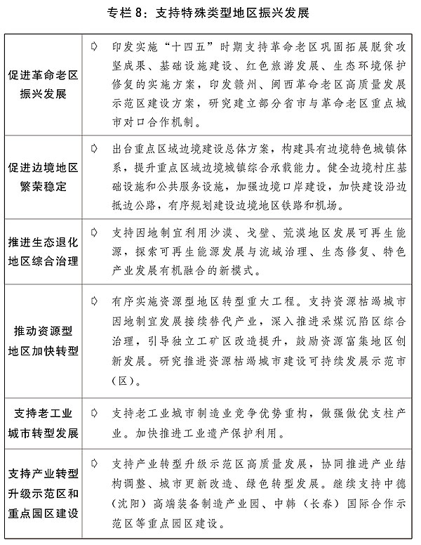 二是提高區(qū)域協(xié)調發(fā)展水平。推動西部大開發(fā)形成新格局,發(fā)揮風、光、水電和礦產資源優(yōu)勢建設大型清潔能源基地。積極發(fā)展文化和旅游產業(yè)。實施重要生態(tài)系統(tǒng)保護和修復工程,加快重大項目規(guī)劃建設。推進貴州大數(shù)據(jù)綜合試驗區(qū)建設。積極穩(wěn)妥推進雅魯藏布江下游水電開發(fā)等重大工程。推動東北振興取得新突破,組織實施好東北全面振興“十四五”實施方案,繼續(xù)推進黑瞎子島中俄國際合作示范區(qū)建設,積極推動大小興安嶺林區(qū)生態(tài)保護與經(jīng)濟轉型,穩(wěn)步推進長吉圖開發(fā)開放先導區(qū)發(fā)展,推動《東北振興重點項目三年滾動實施方案》重點項目加快建設。推動中部地區(qū)高質量發(fā)展,推動湘鄂贛協(xié)同高質量發(fā)展,支持晉陜豫黃河金三角承接產業(yè)轉移示范區(qū)建設,支持山西進一步深化能源革命綜合改革試點,推進淮海合作區(qū)協(xié)同發(fā)展,支持中國(武漢)光谷建設,編制出臺洞庭湖生態(tài)經(jīng)濟區(qū)規(guī)劃。鼓勵東部加快高質量發(fā)展,支持福建高質量發(fā)展及平潭綜合實驗區(qū)建設,推動山東新舊動能轉換綜合試驗區(qū)建設取得新進展。支持民族地區(qū)改善生產生活條件,加強各民族交流交往交融,鑄牢中華民族共同體意識。推動革命老區(qū)、邊境地區(qū)、生態(tài)退化地區(qū)、資源型地區(qū)、老工業(yè)城市等特殊類型地區(qū)振興發(fā)展,推進國家級新區(qū)、臨空經(jīng)濟示范區(qū)、承接產業(yè)轉移示范區(qū)等功能平臺建設,推動國家自主創(chuàng)新示范區(qū)和高新區(qū)高質量發(fā)展。支持海洋經(jīng)濟發(fā)展示范區(qū)、現(xiàn)代海洋城市等建設,提升海洋資源開發(fā)利用水平。