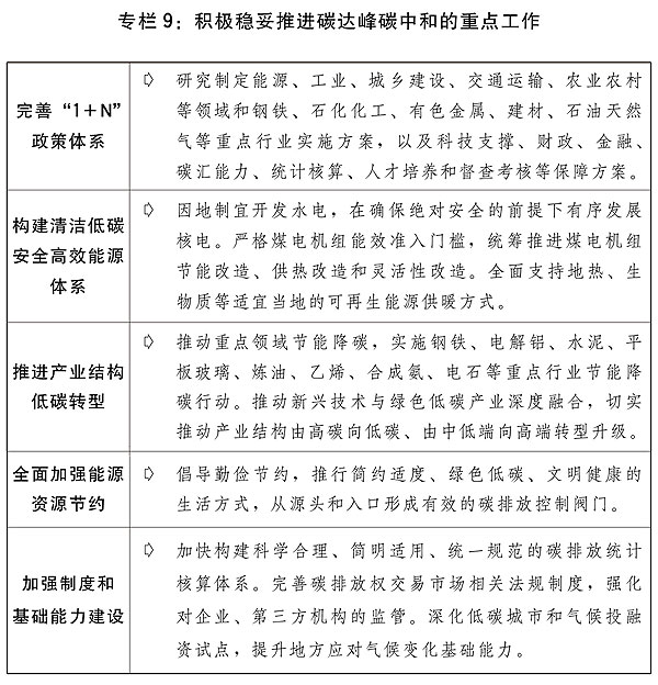 二是積極穩(wěn)妥推進碳達峰碳中和。完善碳達峰碳中和“1+N”政策體系,實施“碳達峰十大行動”,堅持“全國一盤棋”。大力發(fā)展非化石能源,建設大型風電、光伏基地項目,積極發(fā)展分布式新能源,積極推動海上風電集群化開發(fā),穩(wěn)妥推進西南等地大型水電基地建設,大力發(fā)展抽水蓄能,在確保絕對安全的前提下積極有序發(fā)展核電,推進煤炭清潔高效利用。提升電網(wǎng)對可再生能源發(fā)電的消納能力。做好全國碳排放權交易市場第二個履約周期管理。實施節(jié)能降碳改造升級。積極研究開發(fā)碳捕捉利用與封存技術。優(yōu)化完善能耗雙控政策,合理增加能耗總量彈性,新增可再生能源和原料用能不納入能源消費總量控制,推動能耗“雙控”向碳排放總量和強度“雙控”轉變。全面加強能源資源節(jié)約,強化工業(yè)、交通和建筑節(jié)能,不斷降低單位產出能耗物耗和碳排放。對標能效標桿水平,推動能效低于基準水平的重點行業(yè)企業(yè),有序實施改造升級,促進高耗能行業(yè)高質量發(fā)展。繼續(xù)做好碳達峰碳中和及應對氣候變化國際談判與合作,主動參與全球綠色治理體系建設,加強綠色經(jīng)貿、技術與金融合作。