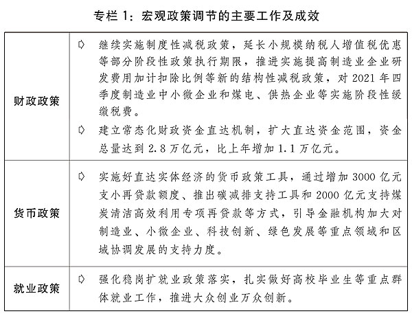 二是保持宏觀政策連續(xù)性針對性。宏觀政策適應跨周期調節(jié)需要,保持對經(jīng)濟恢復必要支持力度,同時考慮為今年應對困難挑戰(zhàn)預留政策空間。積極的財政政策提質增效、更可持續(xù)。保持必要的財政支出規(guī)模,地方政府專項債券發(fā)行使用管理進一步優(yōu)化,建立常態(tài)化財政資金直達機制,將2.8萬億元中央財政資金納入直達范圍,及時為基層保基本民生、保工資、保運轉提供財力支持。全年新增減稅降費為市場主體減負超過1萬億元。對制造業(yè)中小微企業(yè)、煤電和供熱企業(yè)實施階段性緩繳稅費。貨幣政策靈活精準、合理適度,靈活運用降準、再貸款、再貼現(xiàn)等多種政策工具,兩次全面降準,流動性保持合理充裕,廣義貨幣供應量(M2)余額和社會融資規(guī)模存量分別增長9%和10.3%。加大對實體經(jīng)濟、重點領域和薄弱環(huán)節(jié)的支持力度,企業(yè)綜合融資成本穩(wěn)中有降,全年新增人民幣貸款19.95萬億元,比上年多增3150億元,大型商業(yè)銀行普惠小微企業(yè)貸款增幅超過40%,企業(yè)貸款平均利率為4.61%,比上年下降0.1個百分點。強化穩(wěn)崗擴就業(yè)政策落實,扎實做好高校畢業(yè)生等重點群體就業(yè)工作,推進大眾創(chuàng)業(yè)萬眾創(chuàng)新。