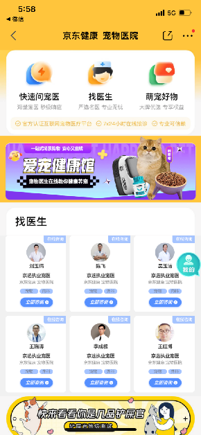 目前,京東健康寵物醫(yī)院提供包括犬、貓、全科等七個(gè)科室的7×24免費(fèi)在線健康咨詢服務(wù),截至2021年底,已有超過5000位寵物醫(yī)生在線服務(wù),用戶能夠享受圖文咨詢和視頻咨詢兩種服務(wù)方式。寵物主只需要打開京東APP,搜索“寵物醫(yī)院”,執(zhí)業(yè)醫(yī)生就會(huì)提供防疫指導(dǎo)和急癥處理,包括寵物居家情緒疏導(dǎo)指引、寵物居家隔離慢病管理、寵物突發(fā)健康狀況在線急救等。