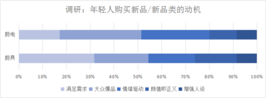在此前京東發(fā)起的一項調(diào)研中,分析35歲以下人群購買廚房電器/廚具的動機可見,年輕人購買廚房電器時,受大眾口碑影響很大,而對廚具的顏值、設(shè)計感(增加人設(shè))的敏感度明顯更高。比如近幾年年輕人尤其是女性熱衷購買的顏值琺瑯鍋,無論是馬卡龍色還是鳶尾紫色,擺在廚房就是一道靚麗的風景線。京東春季家裝節(jié)數(shù)據(jù)顯示,鍋具顏值擔當?shù)拇砜岵市驴瞵m瑯鍋在開門紅的前28小時內(nèi)成交額同比增長15倍。