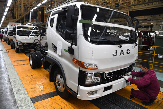 4月21日,工人在江淮汽車新港基地輕卡生產(chǎn)線上忙碌。