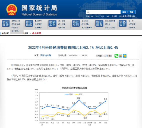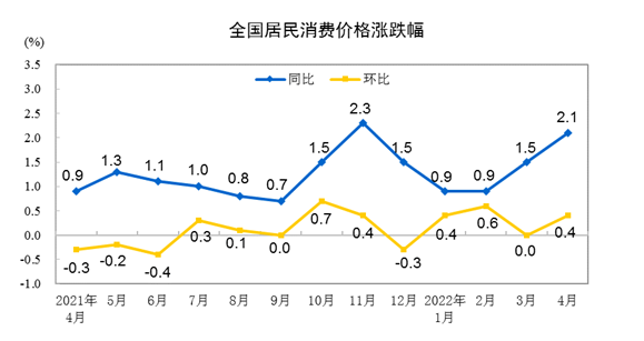 2022年4月份,全國(guó)居民消費(fèi)價(jià)格同比上漲2.1%。其中,城市上漲2.2%,農(nóng)村上漲2.0%;食品價(jià)格上漲1.9%,非食品價(jià)格上漲2.2%;消費(fèi)品價(jià)格上漲3.0%,服務(wù)價(jià)格上漲0.8%。1--—4月平均,全國(guó)居民消費(fèi)價(jià)格比上年同期上漲1.4%。