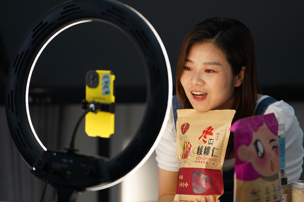5月12日,殘疾人網絡主播渭梅女在西安一家直播產業(yè)基地直播帶貨。