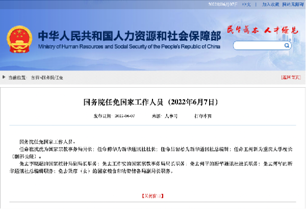 據(jù)人社部官網(wǎng)7日消息,國務院任免國家工作人員: