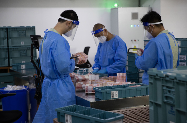 在上海銀行現(xiàn)金中心智能金庫,工作人員對現(xiàn)金進行預(yù)處理,將現(xiàn)金放進標準化容器,以便由帶有消毒模塊的大型清分機進行自動清分作業(yè)。