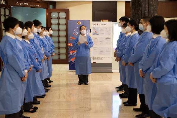 李婷(中)在給團(tuán)隊(duì)開(kāi)晨會(huì),傳達(dá)當(dāng)天的服務(wù)要求。