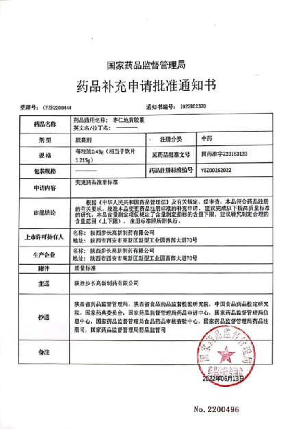 公司于2021年確定棗仁地黃膠囊黃芩苷質(zhì)量標(biāo)準(zhǔn)修訂研究,擬定質(zhì)量標(biāo)準(zhǔn)通過了陜西省食品藥品監(jiān)督檢驗(yàn)研究院技術(shù)復(fù)核,于2022年04月向國(guó)家局提交變更注冊(cè)標(biāo)準(zhǔn)的申請(qǐng),近日已取得國(guó)家藥品監(jiān)督管理局藥品補(bǔ)充申請(qǐng)批準(zhǔn)通知書。