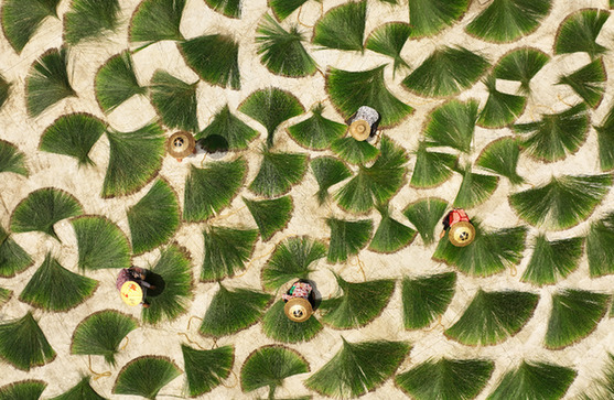 7月6日,在湖南省衡陽市祁東縣金橋鎮(zhèn)金龍村,村民在晾曬席草(無人機照片)。