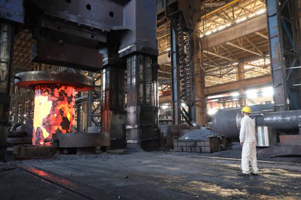 水壓機(jī)鍛造廠車間內(nèi),一個(gè)10米多長(zhǎng)、5米多寬的巨型鐵剪,正夾著一個(gè)燒得火紅透亮的合金鋼錠來(lái)到水壓機(jī)前,在咣咣的鍛壓聲中火星四射,很快就縮小了一大圈。