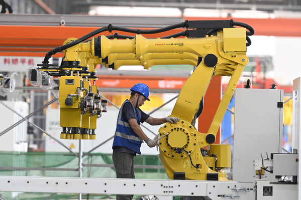 7月24日傍晚,在廣西柳州柳工集團(tuán)柳工裝載機(jī)燈塔工廠項(xiàng)目工地,工人在車間里調(diào)試設(shè)備。