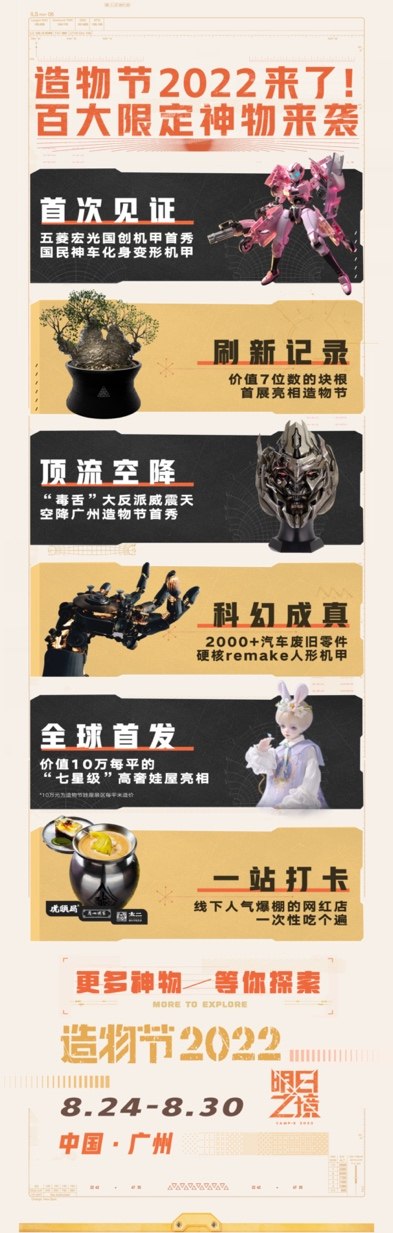 在會場,主辦方還打造了全感式互動設(shè)計,觀眾可通過店鋪互動穿戴設(shè)備尋找神物能量,沉浸式穿越火線,360度深度體驗“游戲化”的營地探險。同時,今年造物節(jié)線上線下緊密融合,不能親臨現(xiàn)場的網(wǎng)友也能在線上4D逛展,一起加入這場燃爆的“創(chuàng)意嘉年華”,共同感受中國年輕人迸發(fā)的創(chuàng)造力。