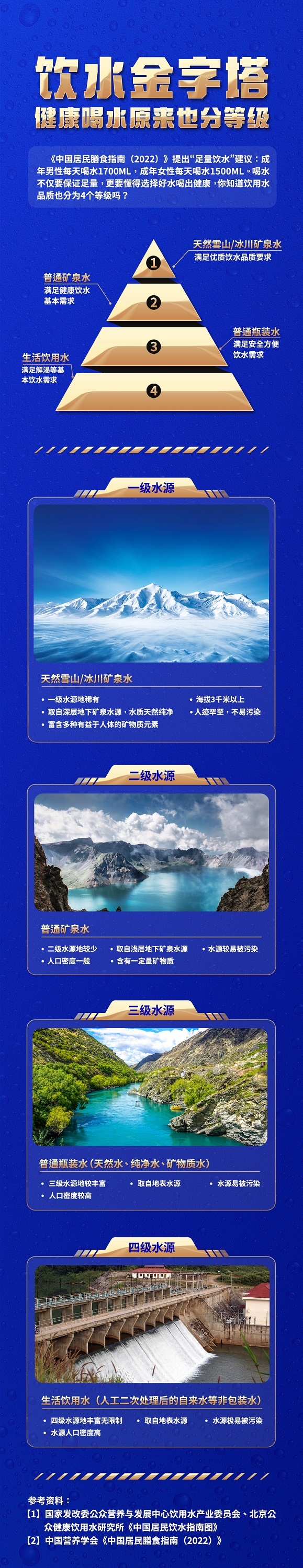 健康時報官方平臺發(fā)布了飲水金字塔科普長圖,以水源地為核心標準將日常飲用水分為四級,包括高海拔雪山冰川礦泉水、普通礦泉水、江河湖泊水及自來水。雪山/冰川礦泉水作為一級好水,大多來自于海拔3000米以上的雪山冰川地區(qū),富含均衡豐富的礦物質(zhì),長期飲用對健康大有裨益。