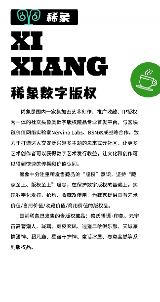 稀象一直相信以政策為主導的版權IP交易市場,才是數(shù)藏流轉(zhuǎn)市場的最后歸宿。并且始終堅定如一地相信,好的版權IP一定是能夠連續(xù)產(chǎn)出版權價值,以及成為具有真正收藏意義的稀缺版權作品。