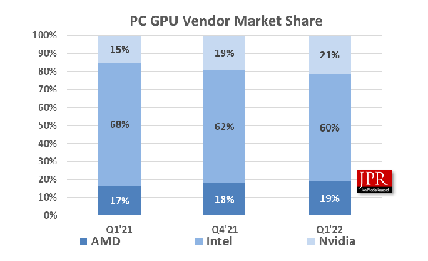 對(duì)于GPU,Intel自然是不陌生的,在PC顯卡市場(chǎng)上其實(shí)一直占據(jù)著領(lǐng)先地位。根據(jù)權(quán)威市調(diào)機(jī)構(gòu)Jon Peddie Research的數(shù)據(jù),2021年第一季度,Intel在PC GPU顯卡市場(chǎng)上的份額高達(dá)68%,2022年第一季度依然有60%。