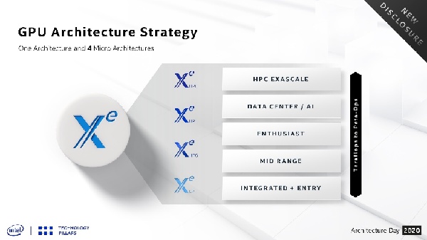 為此,Intel設(shè)計(jì)了全新的Xe GPU架構(gòu),并細(xì)分為主打集成顯卡和入門獨(dú)顯的超低功耗Xe LP、針對(duì)游戲優(yōu)化的高性能圖形Xe LPG、面向數(shù)據(jù)中心和AI應(yīng)用的高性能Xe HP、適合超級(jí)計(jì)算的高性能計(jì)算Xe HPC四種微架構(gòu),
