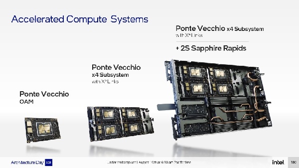 Xe HPC架構(gòu),首款產(chǎn)品代號(hào)Ponte Vecchio,多工藝多芯片整合封裝,已經(jīng)出貨,將與下一代可擴(kuò)展至強(qiáng)Sapphire Rapids聯(lián)手用于百億億次級(jí)超級(jí)計(jì)算機(jī)Aurora。