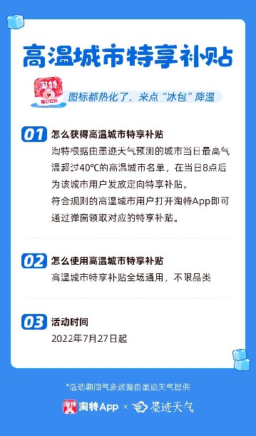 618“滿30減5”玩法火遍全網(wǎng)后,近日淘特又給消費(fèi)者帶來新驚喜:發(fā)高溫補(bǔ)貼冰紅包。淘特冰紅包發(fā)放始于7月27日,具體玩法是,淘特與墨跡天氣APP合作,通過夏日促銷節(jié)每天向氣溫達(dá)40℃城市消費(fèi)者發(fā)放特享冰紅包。