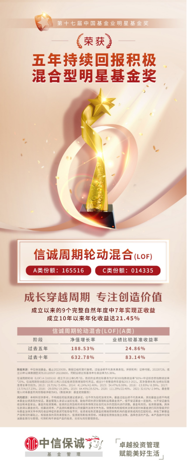 今天(7月29日),第十七屆中國基金業(yè)明星基金獎榜單發(fā)布,全市場僅56只基金獲獎,中信保誠基金旗下產(chǎn)品信誠周期輪動混合獲頒五年持續(xù)回報積極混合型明星基金獎。